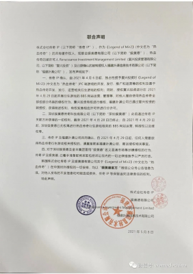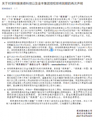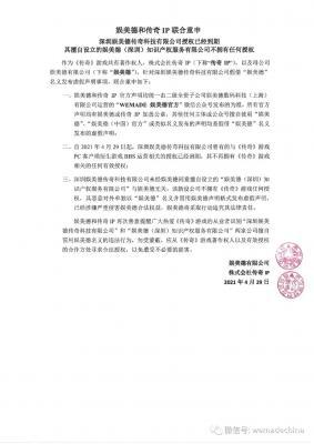 202105-211:深圳娱美德传奇科技有限公司(以下简称“深圳娱美德”)此前通过传奇IP关联方所获得的一切权利,截至2021年4月28日已终止。自...